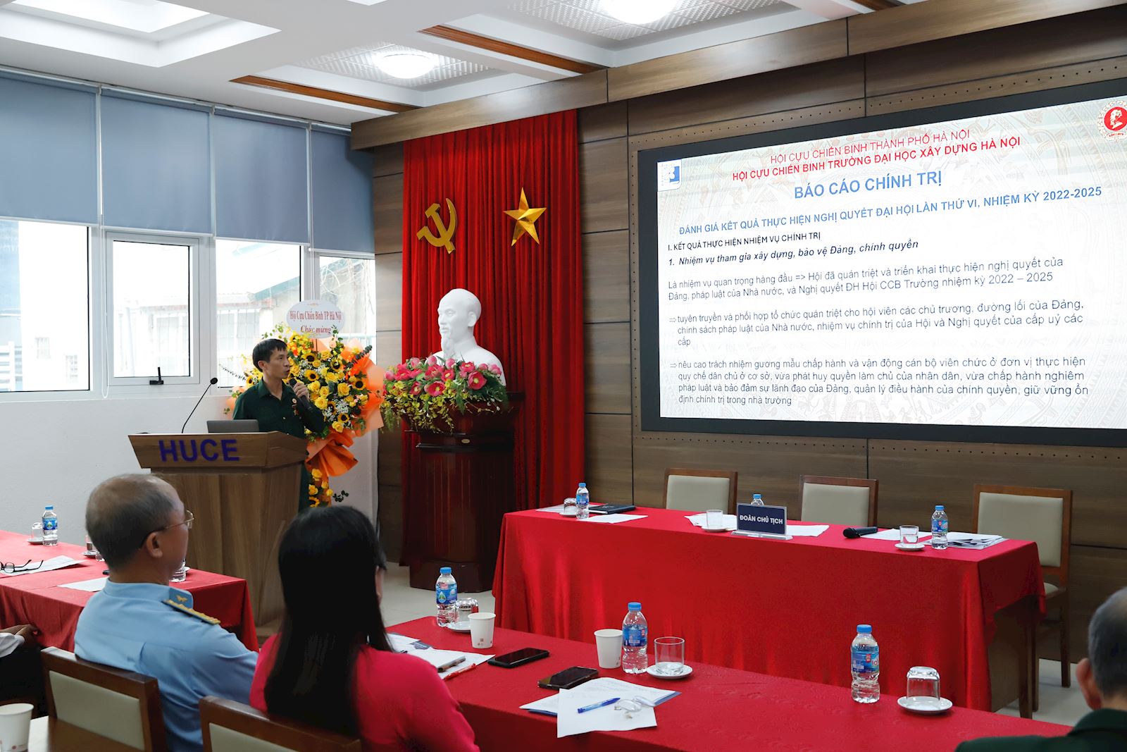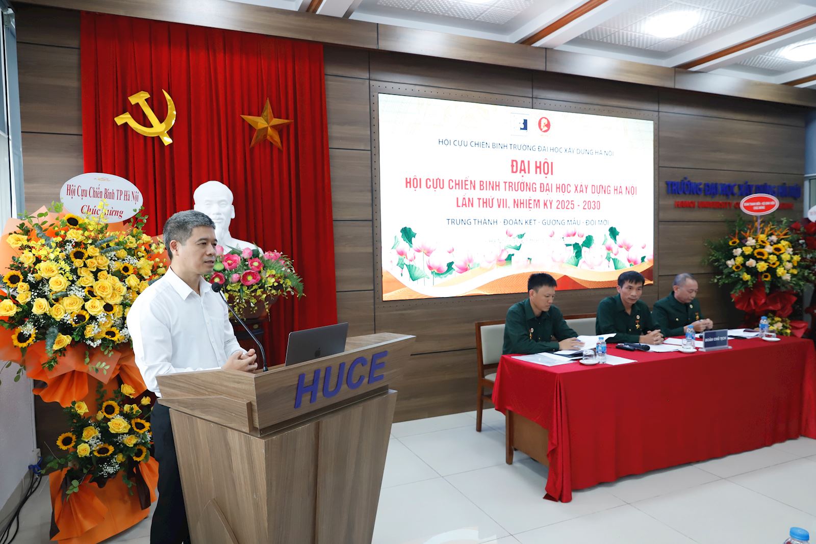 Phát biểu tại Đại hội, đồng chí Hoàng Tùng - Phó Bí thư Đảng ủy, Hiệu trưởng, Chỉ huy trưởng BCHQS Trường ĐHXDHN ghi nhận những đóng góp tích cực, hiệu quả của Hội CCB Trường trong nhiệm kỳ vừa qua với các kết quả tích cực và được Hội CCB TP. Hà Nội tặng Bằng khen cũng như Giấy khen của Nhà trường. Đồng chí Hiệu trưởng cũng đề nghị các hội viên tiếp tục phát huy tinh thần, phầm chất “anh bộ đội cụ Hồ” cùng xây dựng Hội và đóng góp của Hội cho sự phát triển chung của Nhà trường.
