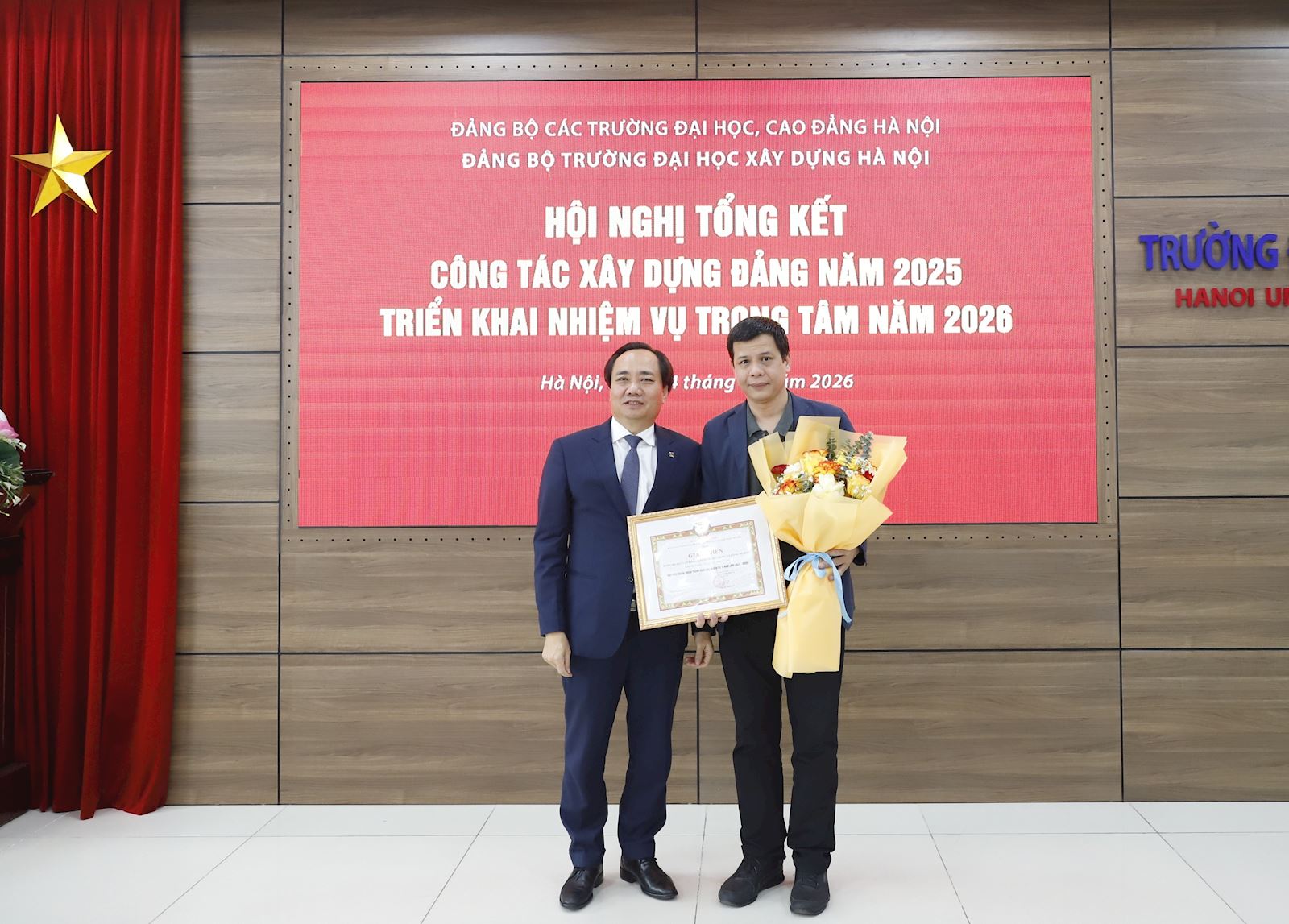 Trong không khí trang trọng của Hội nghị, Ban tổ chức đã công bố các quyết định khen thưởng nhằm ghi nhận những nỗ lực và thành tích nổi bật của tập thể, cá nhân trong công tác xây dựng Đảng năm 2025. Theo đó, Đảng bộ Trường Đại học Xây dựng Hà Nội vinh dự được Thành ủy Hà Nội công nhận là tổ chức đảng "Hoàn thành xuất sắc nhiệm vụ" tiêu biểu năm 2025; cá nhân đồng chí Bí thư Đảng ủy Phạm Xuân Anh vinh dự nhận Bằng khen của Thành ủy Hà Nội.