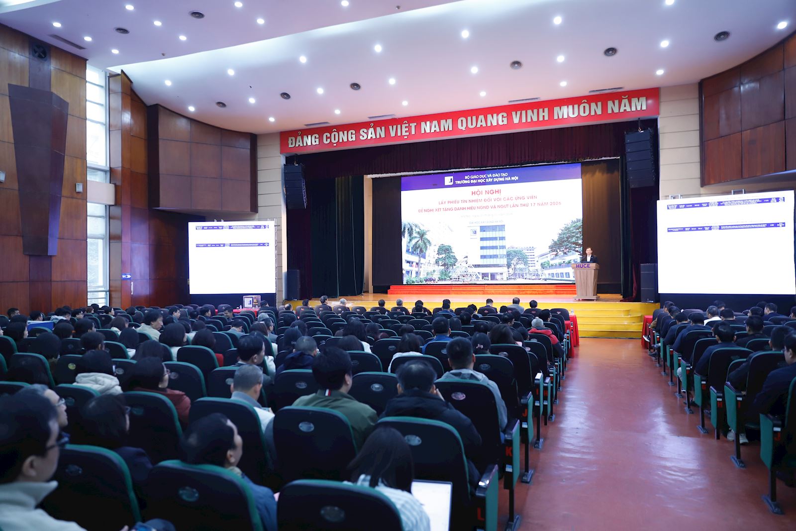 Ngày 21/01/2026, Trường Đại học Xây dựng Hà Nội (ĐHXDHN) tổ chức Hội nghị lấy phiếu tín nhiệm đối với các ứng viên đề nghị xét tặng danh hiệu “Nhà giáo nhân dân”, “Nhà giáo ưu tú” (NGND, NGƯT) lần thứ 17 năm 2026. Hội nghị được tổ chức nghiêm túc, dân chủ, công khai, minh bạch, đúng quy trình, quy định hiện hành với sự tham dự của Ban Giám hiệu Nhà trường, đại diện Đảng ủy, Công đoàn và toàn thể cán bộ viên chức, người lao động trong toàn Trường.