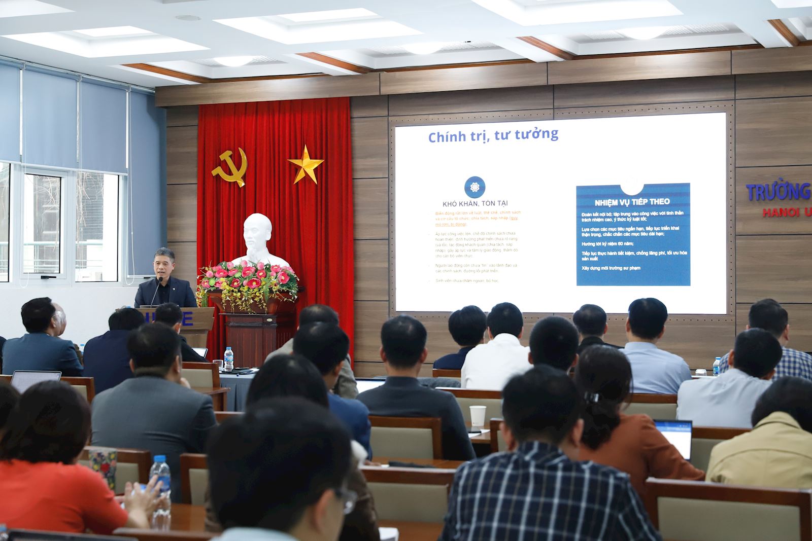 Đồng chí Hoàng Tùng - Hiệu trưởng thay mặt các đồng chí trong Ban Giám hiệu báo cáo chung về các mặt công tác của Nhà trường trong năm học 2024 - 2025