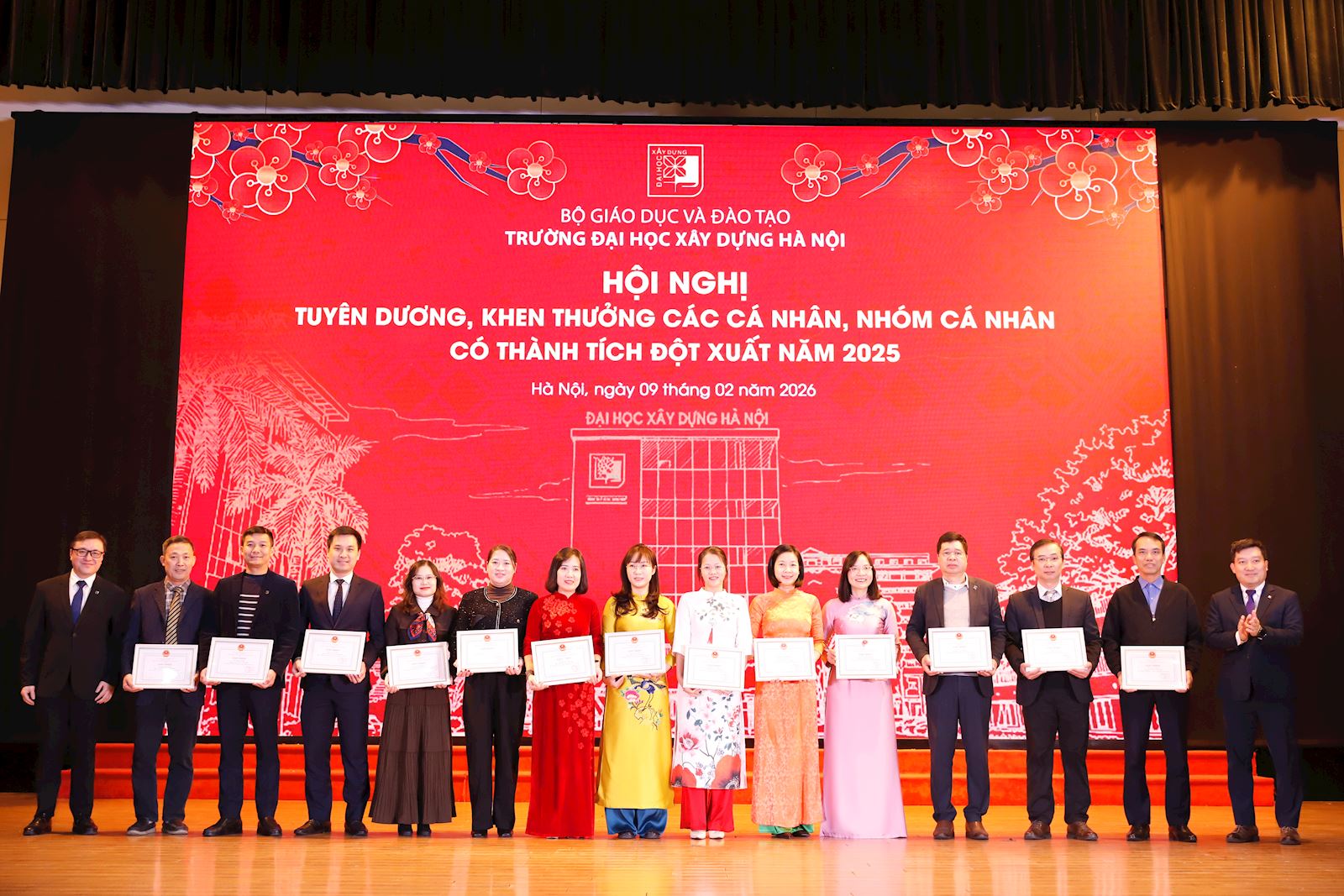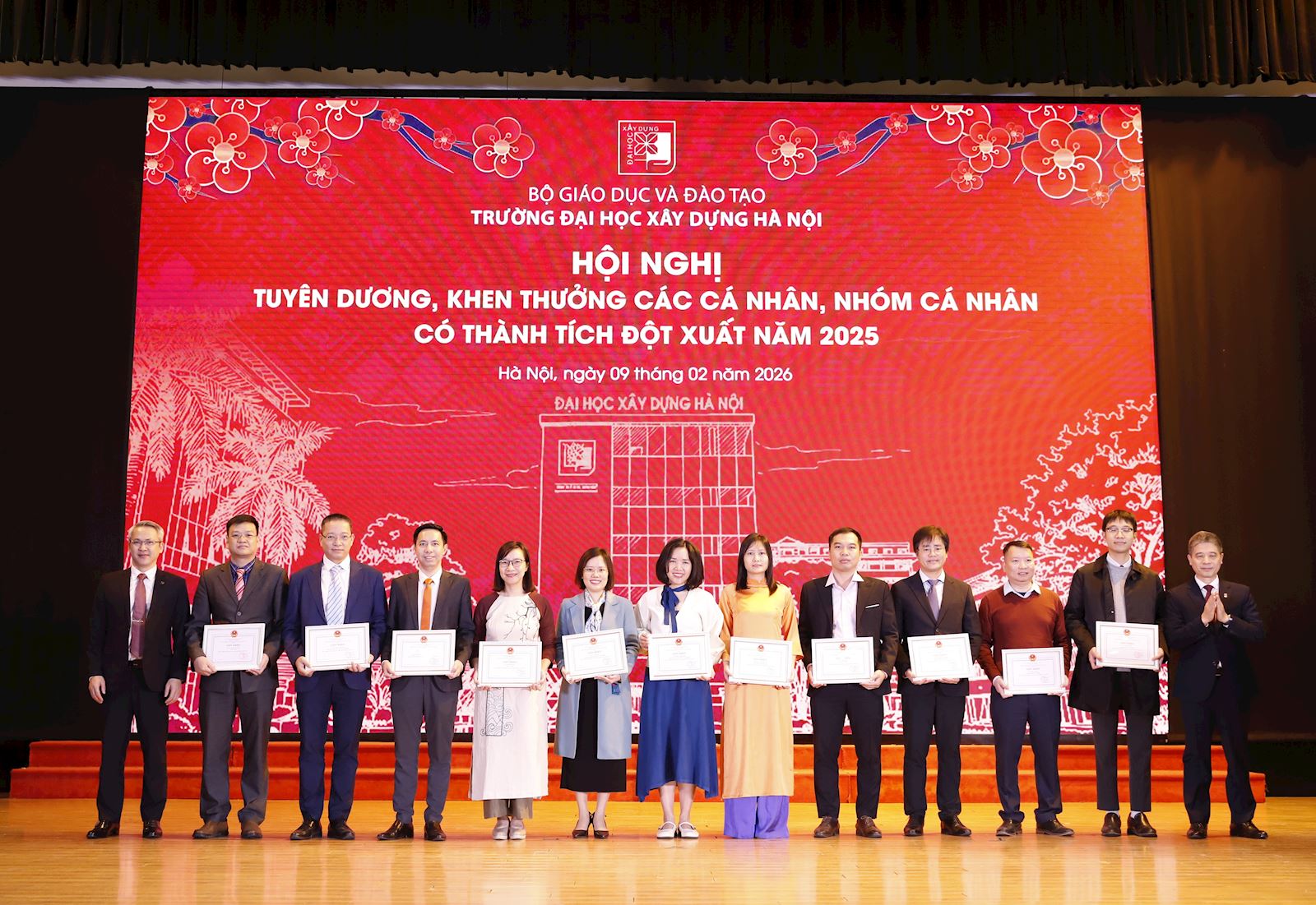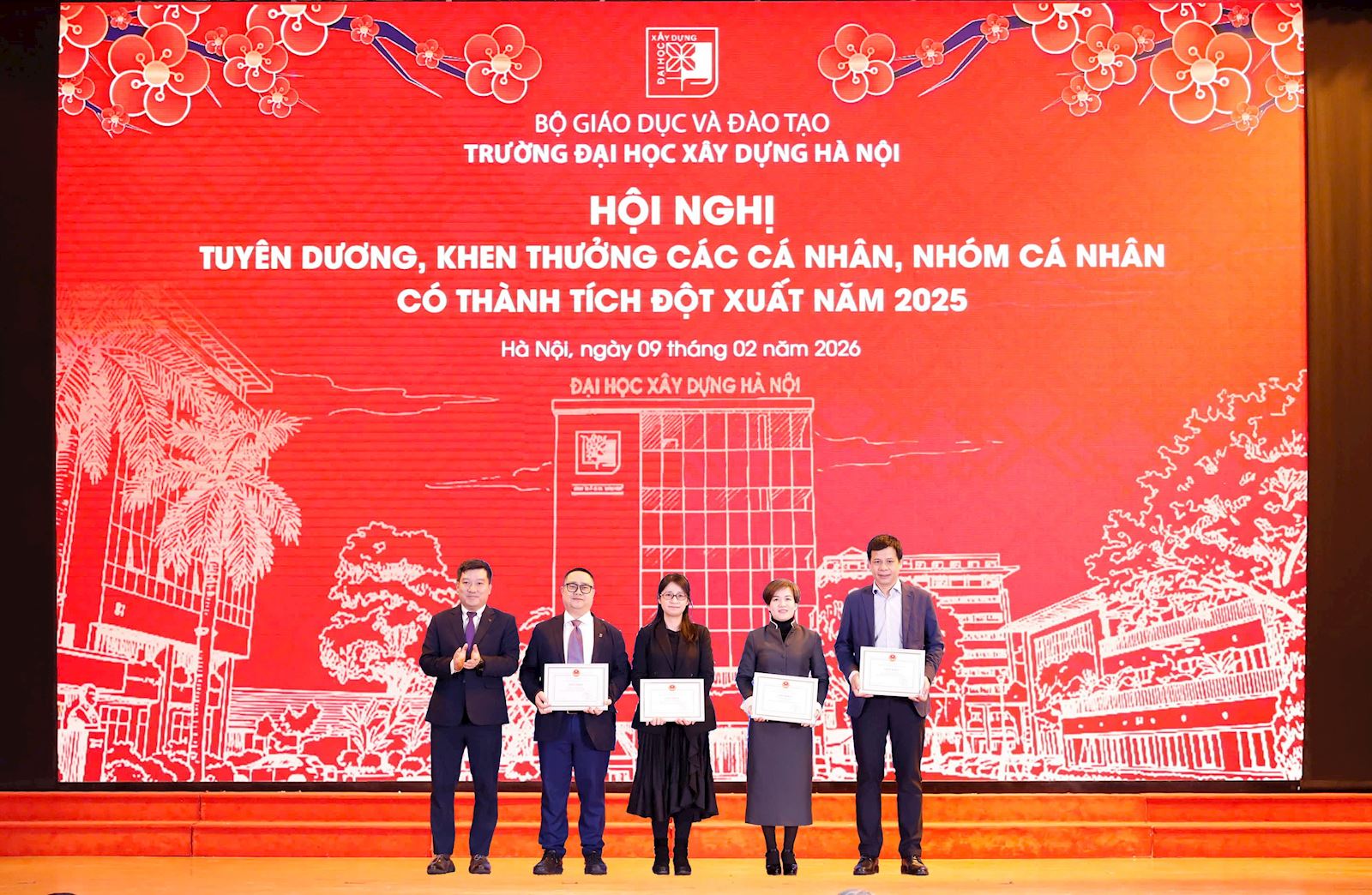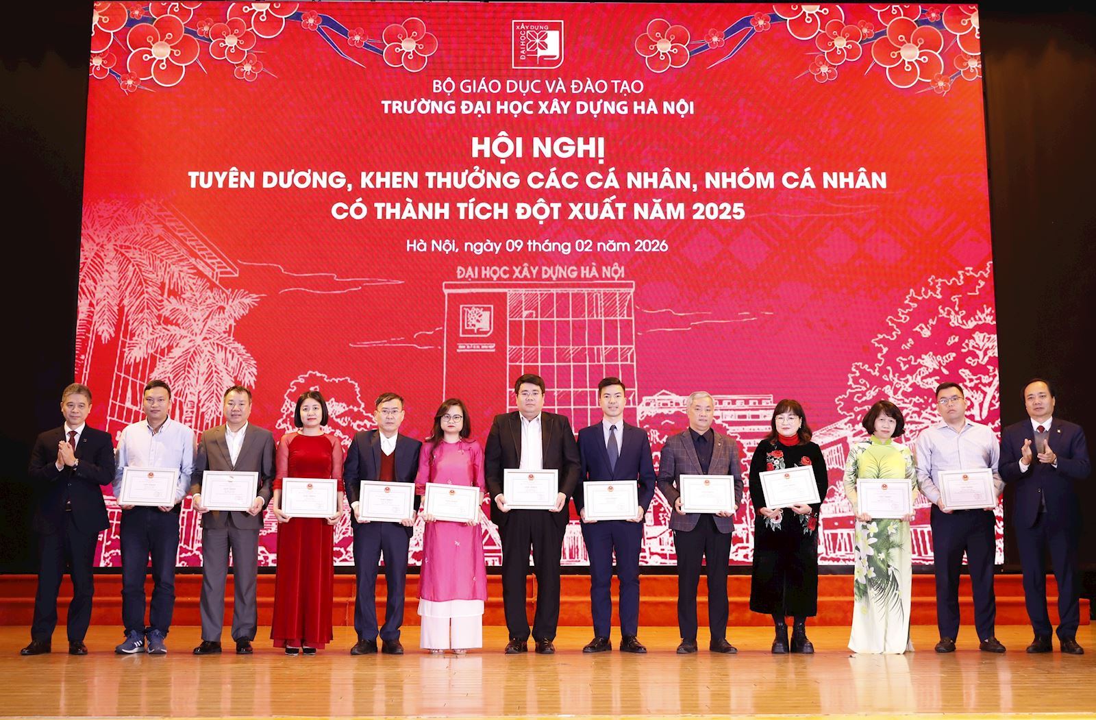 Sáng 09/02/2026, Trường Đại học Xây dựng Hà Nội (ĐHXDHN) long trọng tổ chức Hội nghị tuyên dương, khen thưởng các cá nhân, nhóm cá nhân có thành tích đột xuất năm 2025.