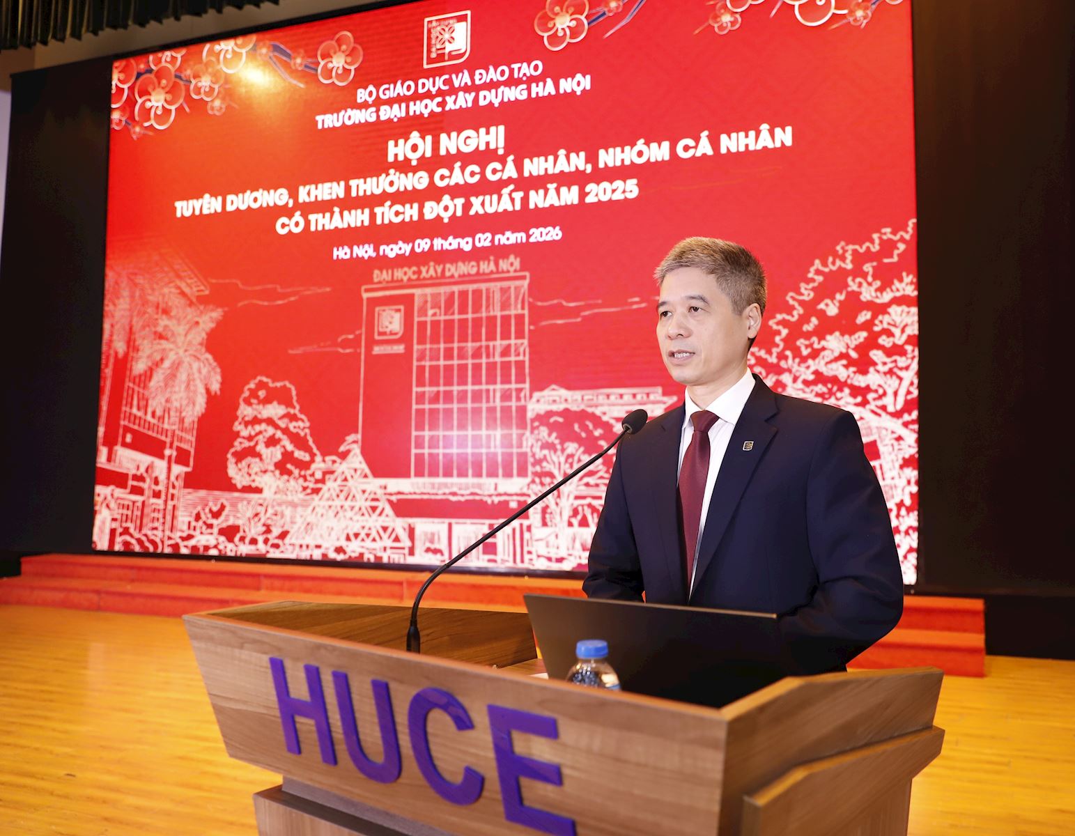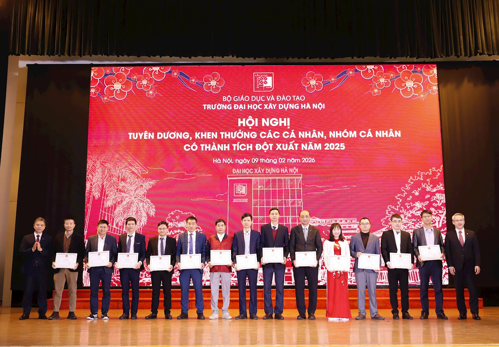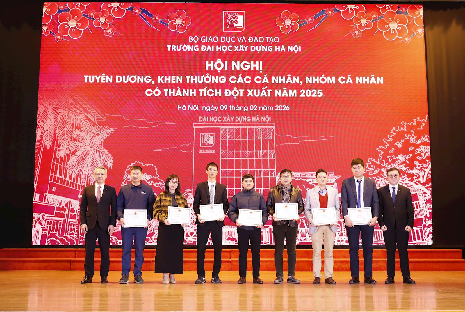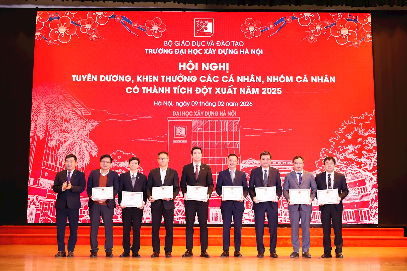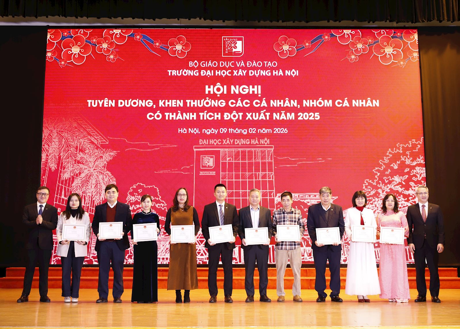 Sáng 09/02/2026, Trường Đại học Xây dựng Hà Nội (ĐHXDHN) long trọng tổ chức Hội nghị tuyên dương, khen thưởng các cá nhân, nhóm cá nhân có thành tích đột xuất năm 2025.