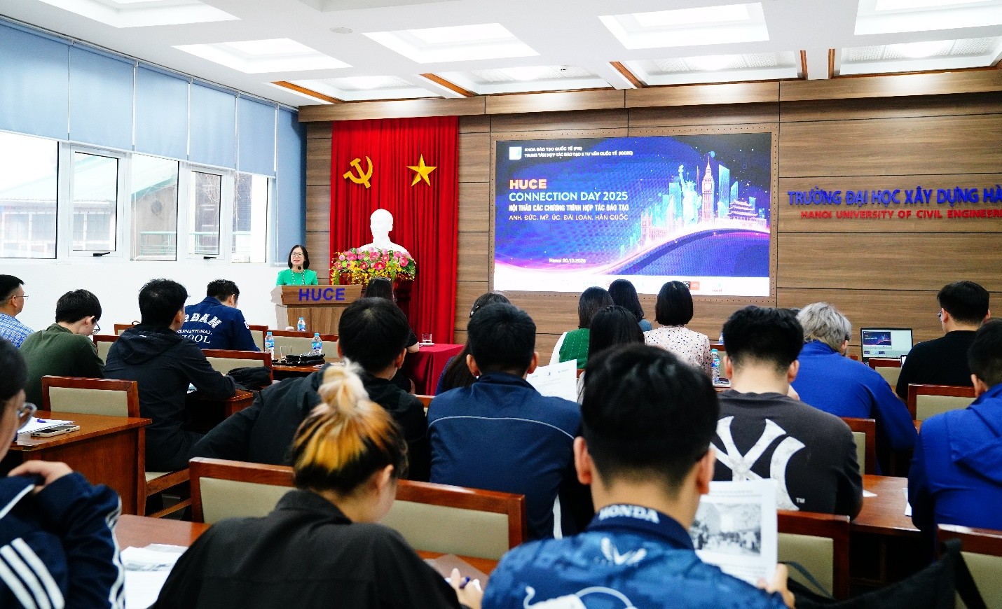 Phát biểu khai mạc Hội thảo, TS. Tạ Quỳnh Hoa – Trưởng Khoa Đào tạo Quốc tế chia sẻ, với truyền thống gần 70 năm đào tạo và nghiên cứu trong lĩnh vực xây dựng – kiến trúc, Nhà trường luôn nỗ lực đổi mới, mở rộng hợp tác với các trường đại học uy tín trên thế giới để mang đến cho sinh viên môi trường học tập hiện đại, đa văn hóa và hội nhập quốc tế. Các bạn sinh viên HUCE không chỉ giỏi chuyên môn mà còn tự tin trong môi trường toàn cầu, có khả năng tiếp cận tri thức tiên tiến, giao lưu học hỏi, và trở thành những kỹ sư, kiến trúc sư mang tầm quốc tế. Hội thảo hôm nay là cầu nối giúp các bạn sinh viên hiểu rõ hơn về cơ hội học tập, chuyển tiếp và nghiên cứu ở nước ngoài, cũng như các chương trình hợp tác Nhà trường đang triển khai .
