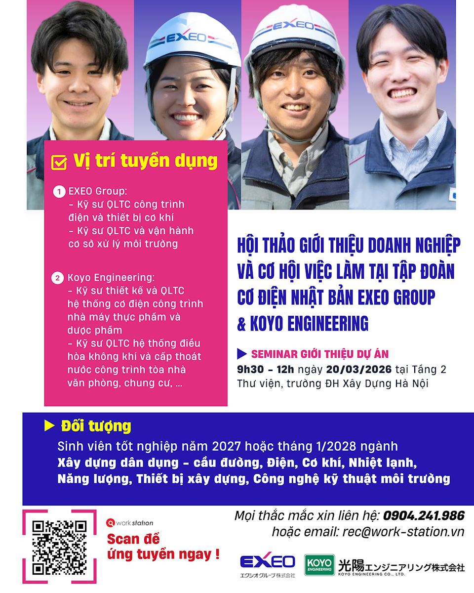Tập đoàn Cơ điện EXEO, Nhật Bản (https://www.exeo.co.jp/en/) là một trong những doanh nghiệp đứng đầu trong lĩnh vực cơ điện, hạ tầng viễn thông, xây dựng dân dụng và môi trường, giải pháp hệ thống và dịch vụ tích hợp tại Nhật Bản. Sau thành công của hai mùa tuyển dụng 2024 - 2025, Tập đoàn tiếp tục thực hiện hoạt động giới thiệu doanh nghiệp và cơ hội việc làm đến với các bạn sinh viên của Trường ĐHXDHN. Chương trình tuyển dụng được thiết kế nhằm tạo cơ hội nghề nghiệp tại Nhật Bản cho sinh viên năm 3, năm 4 các ngành Điện, Cơ khí, Nhiệt lạnh, Năng lượng, Xây dựng tại Trường ĐHXDHN.