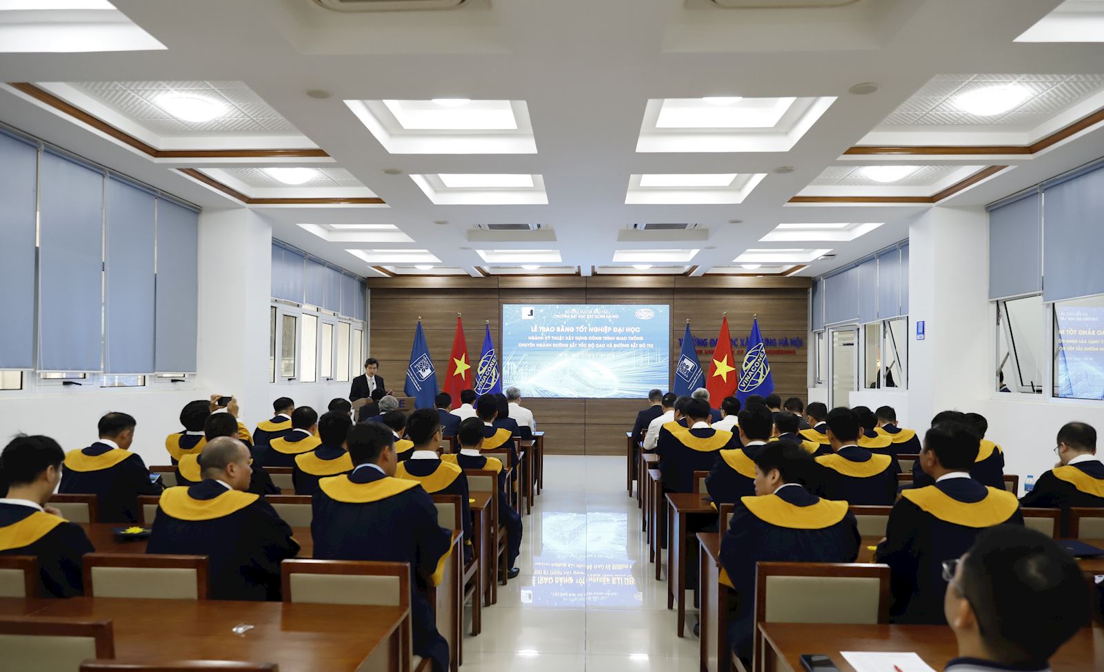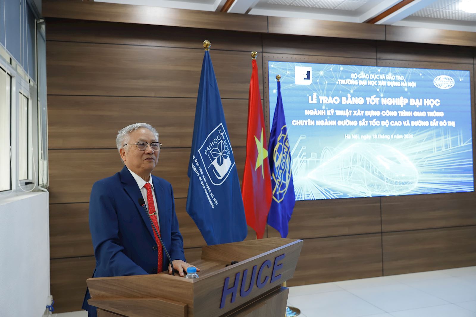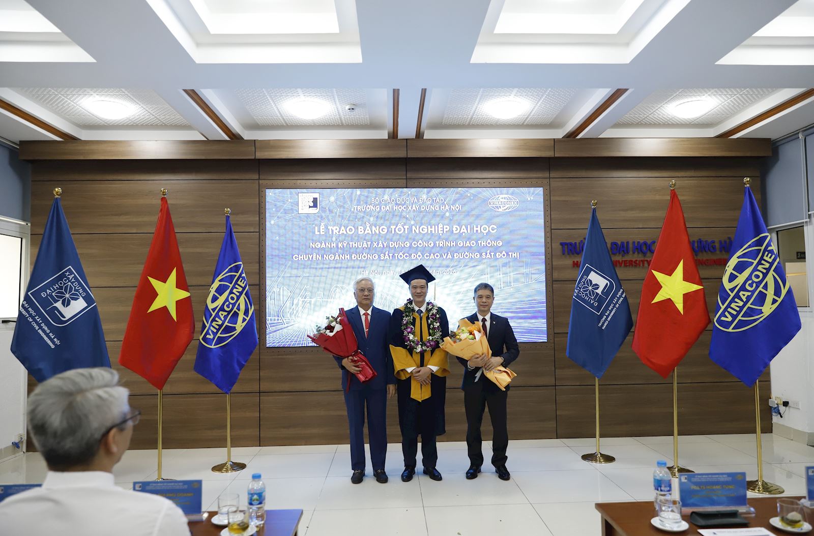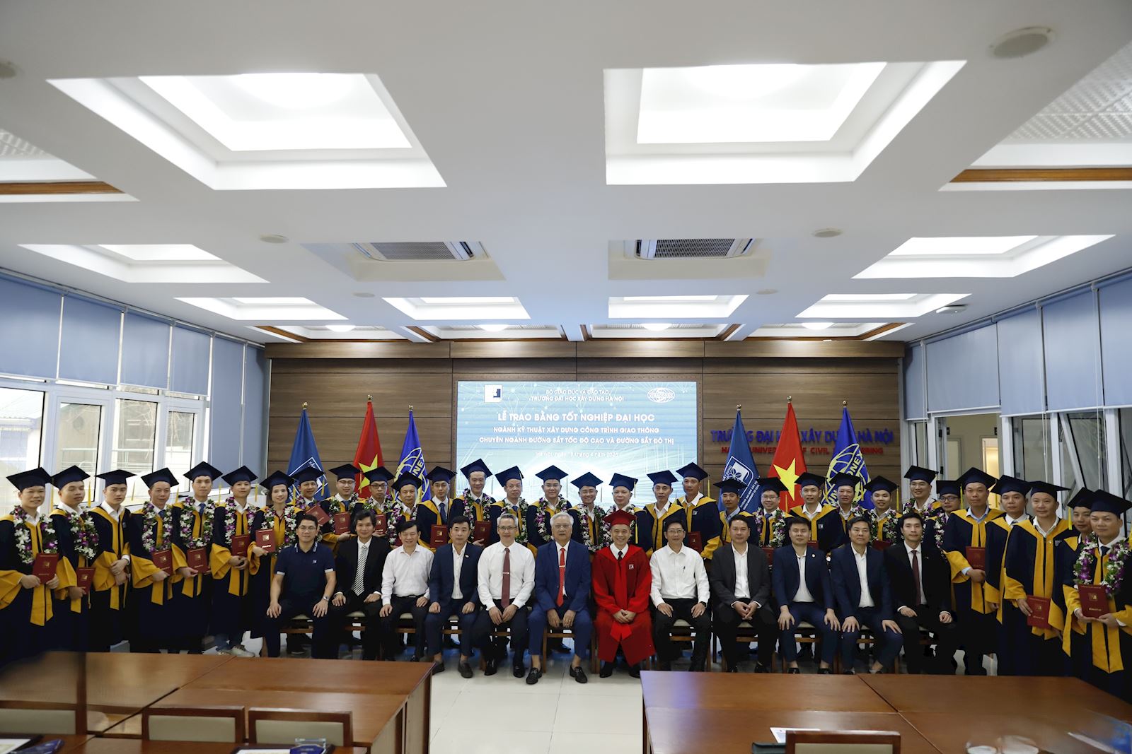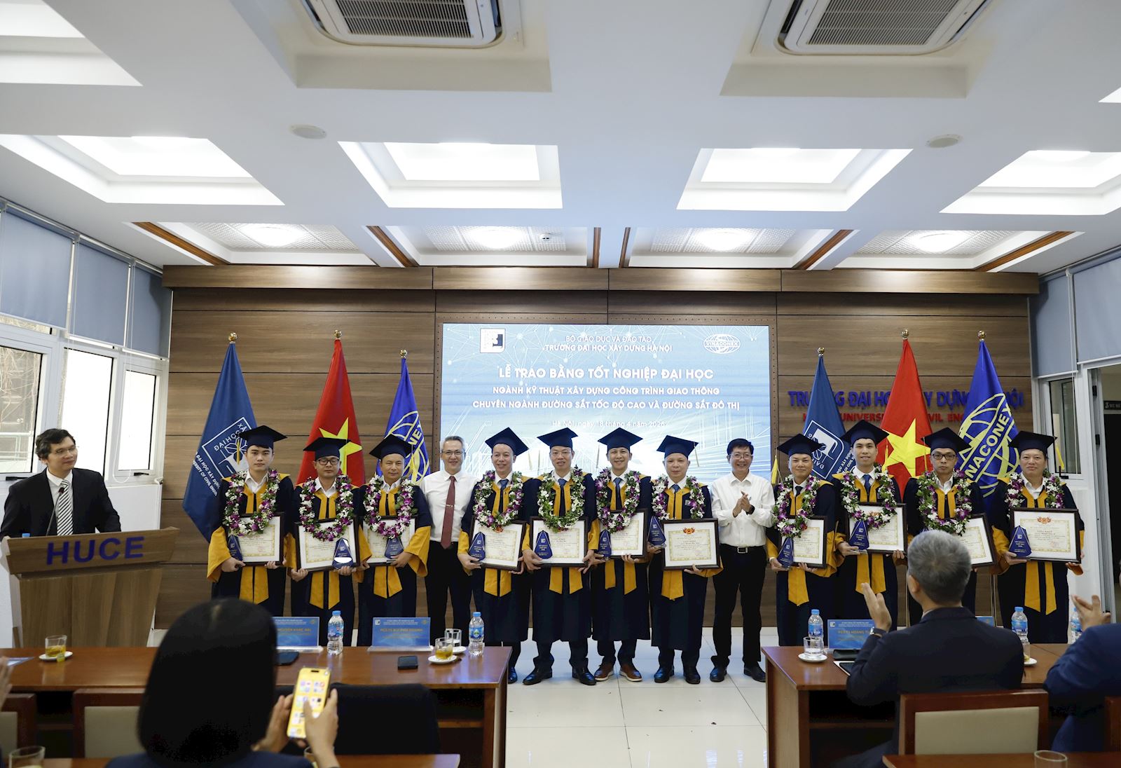 Sáng ngày 18/4/2026, tại Tầng 2 Thư viện Trường Đại học Xây dựng Hà Nội (ĐHXDHN) đã long trọng diễn ra Lễ trao bằng tốt nghiệp cho lớp Kỹ sư chuyên ngành Đường sắt tốc độ cao và đường sắt đô thị