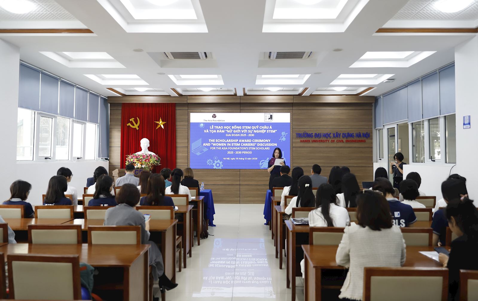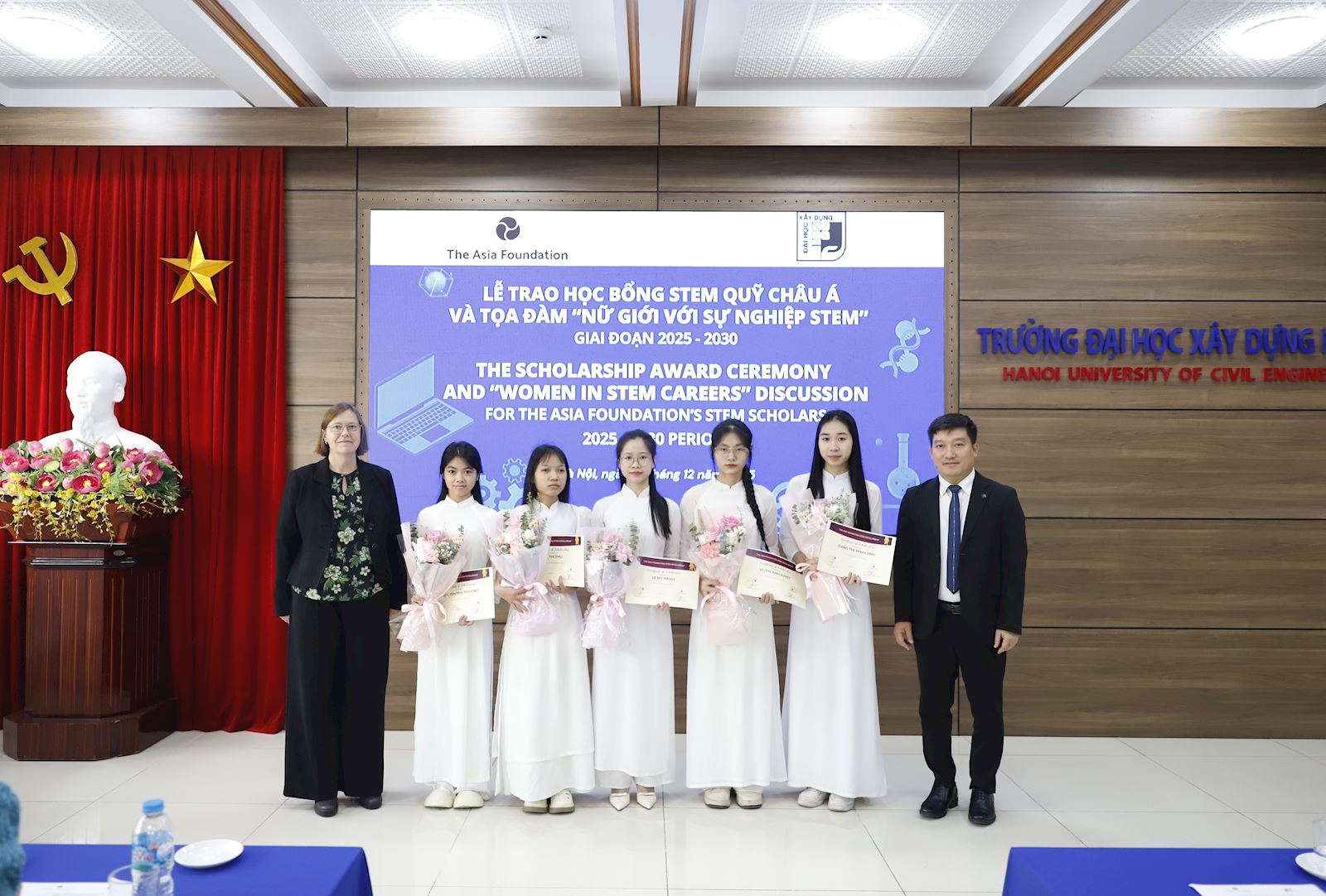 Thứ sáu, ngày 19/12/2025, tại Trường Đại học Xây dựng Hà Nội đã diễn ra chuỗi các hoạt động: Lễ Trao học bổng STEM Quỹ Châu Á, Tọa đàm “Nữ giới với sự nghiệp STEM” và Chương trình đào tạo kỹ năng mềm dành cho các nữ sinh nhận Học bổng.
