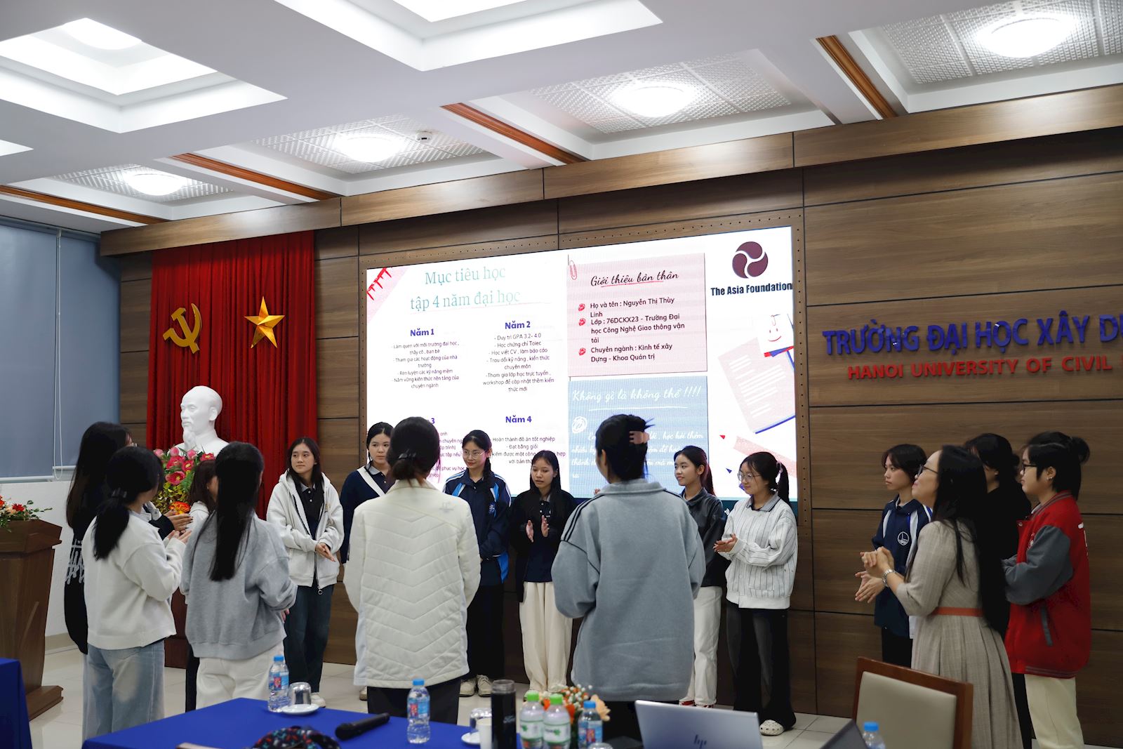 Tham dự Chương trình, về phía Quỹ Châu Á tại Việt Nam có: TS. Nicola Nixon - Quyền Trưởng Đại diện Quỹ Châu Á tại Việt Nam; Cô Đinh Kiều Nhung - Chuyên gia Giáo dục; Cô Hà Thị Anh - Trợ lý Chương trình Giáo dục. Về phía Trường ĐHXDHN có: GS.TS. Nguyễn Hoàng Giang - Phó Hiệu trưởng; TS. Ngô Kim Tuân - Trưởng phòng CTCT và QLSV; ThS. Nghiêm Hà Tân - Phó Trưởng phòng ĐN – HTQT, chuyên viên các Phòng/Khoa và các bạn sinh viên. Về phía khách mời, chuyên gia có cô Phạm Thị Hải Yến - Giảng viên kỹ năng mềm khoa Kinh tế và Quản lý, Trường Đại học Thủy Lợi.