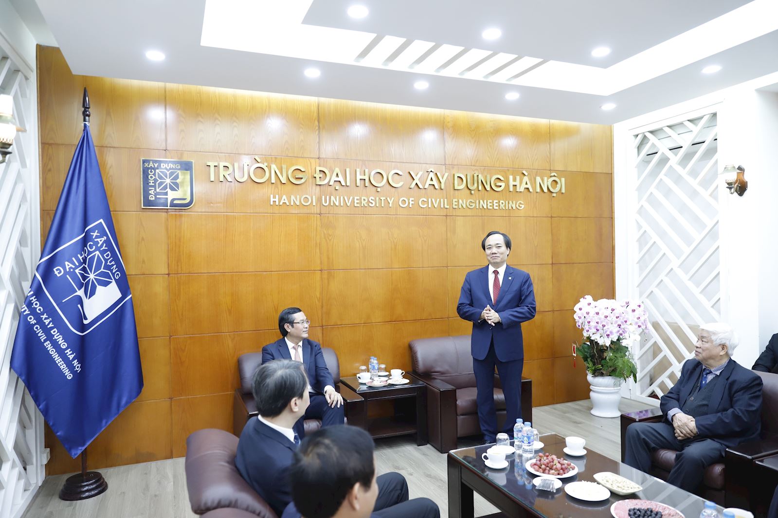 Riêng với Nhà trường, đồng chí Nguyễn Văn Phúc chúc mừng Trường ĐHXDHN đã có nhiều bước phát triển mạnh mẽ, như triển khai thành lập phân hiệu tại TP.HCM và xây dựng nhiều công trình thuộc phân hiệu tại Ninh Bình cũng như đã có nhiều đóng góp tích cực vào các đề án lớn của Chính phủ. Trong bối cảnh ngành Xây dựng giữ vai trò rất quan trọng đối với sự phát triển của đất nước, Thứ trưởng Nguyễn Văn Phúc mong muốn tập thể Nhà trường tiếp tục nỗ lực, phát huy vị thế là ngọn cờ đầu của ngành Giáo dục để đóng góp vào sự phát triển kinh tế - xã hội.