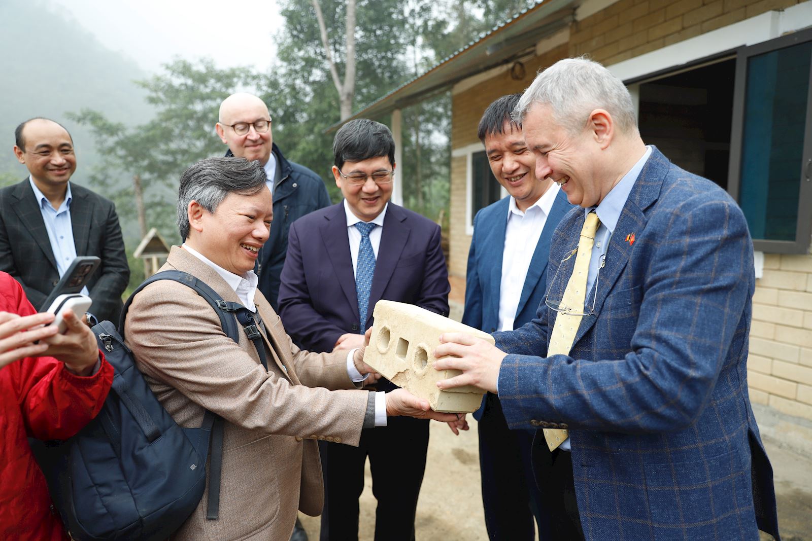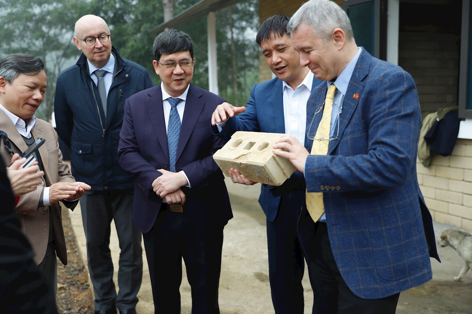 Các nhà khoa học giới thiệu về cách sản xuất và những đặc điểm nổi bật của sản phẩm Gạch đất không nung với Ngài Đại sứ