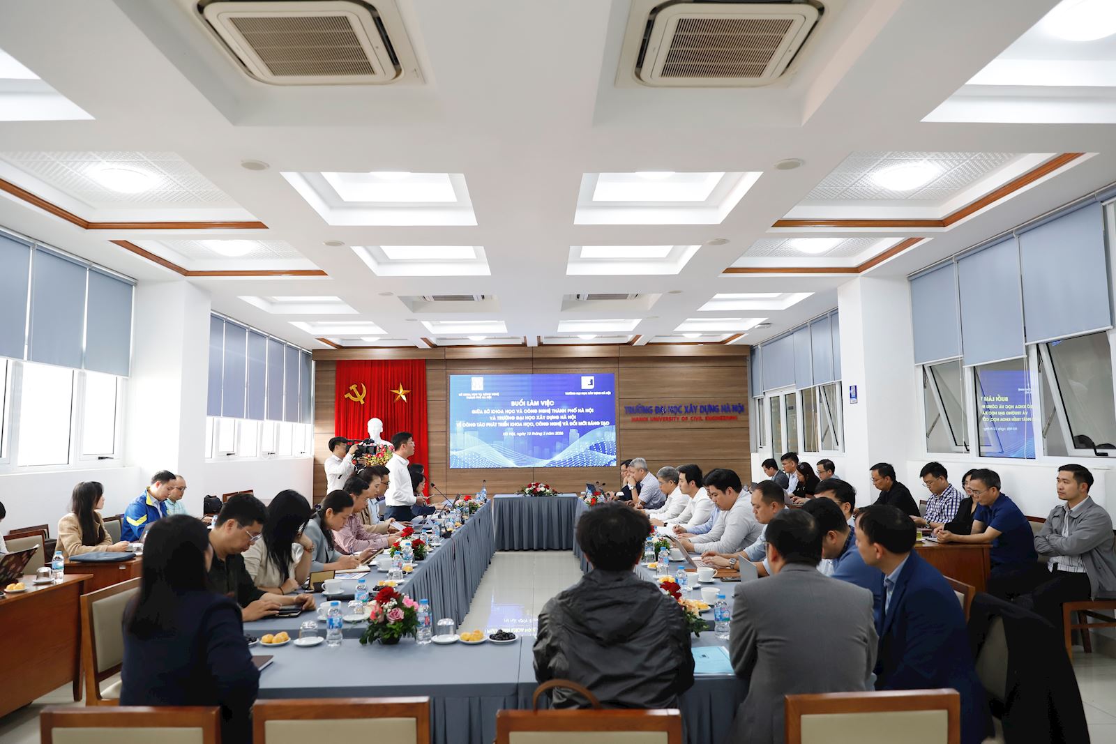Tham dự buổi làm việc, về phía Trường Đại học Xây dựng Hà Nội có PGS.TS. Hoàng Tùng - Hiệu trưởng, PGS.TS. Bùi Phú Doanh - Phó Hiệu trưởng, cùng đại diện lãnh đạo các phòng, khoa, viện nghiên cứu và các nhóm chuyên gia đầu ngành.