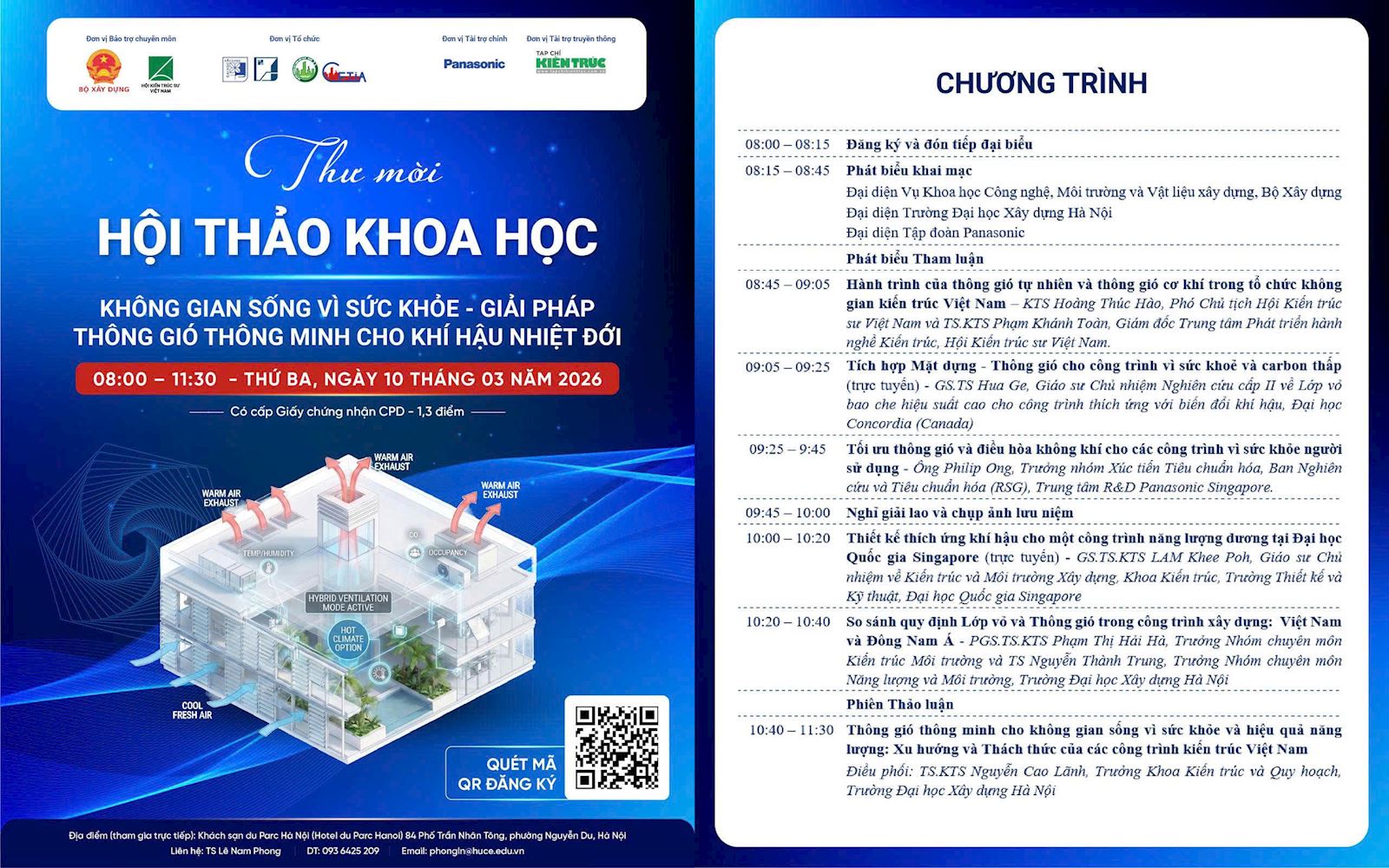Hội thảo khoa học “Không gian sống vì sức khỏe – Giải pháp Thông gió Thông minh cho Khí hậu Nhiệt đới” được tổ chức nhằm kết nối các kiến trúc sư, nhà thiết kế nội thất, kỹ sư hệ thống kỹ thuật công trình, kỹ sư cơ điện – nhiệt lạnh, chủ đầu tư và các chuyên gia trong lĩnh vực môi trường; đồng thời tạo diễn đàn trao đổi, chia sẻ về vai trò của thông gió trong công trình, các công nghệ thông gió tiên tiến và xu hướng thiết kế không gian sống thích ứng với khí hậu nhiệt đới.