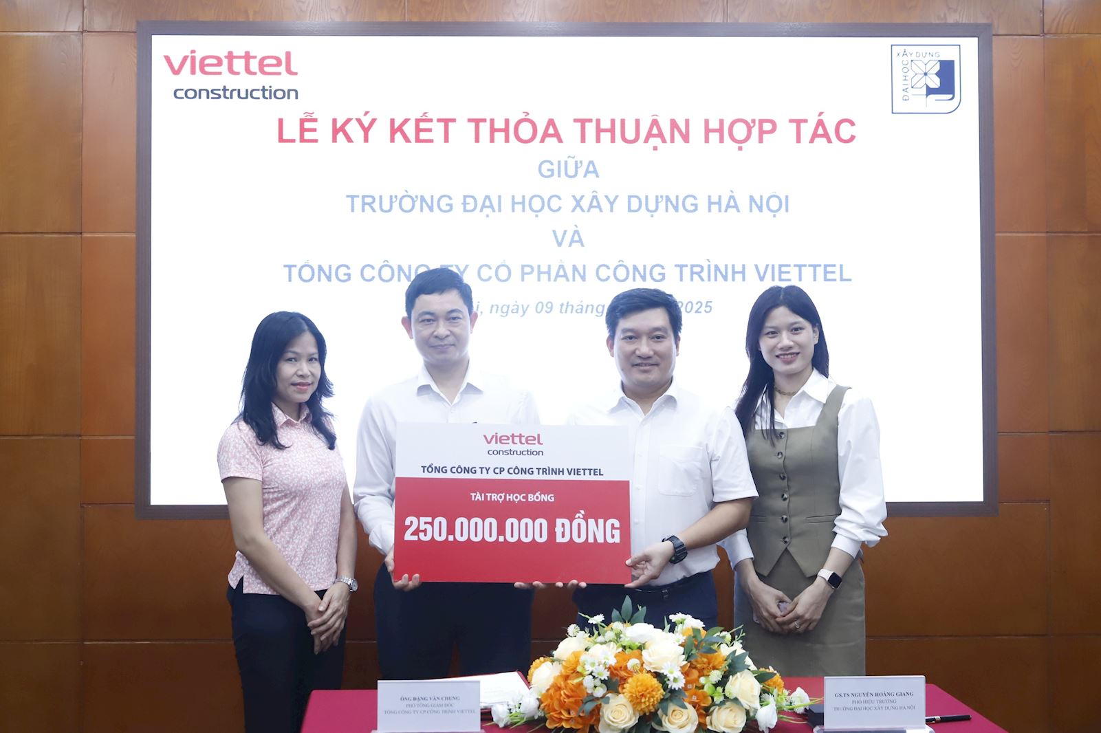 Tại Lễ Ký kết, đại diện Viettel Construction đã tài trợ Quỹ học bổng với giá trị 250.000.000đ để hỗ trợ sinh viên có thành tích học tập xuất sắc, đạo đức tốt. Qua đó góp phần nâng cao chất lượng đào tạo của Nhà trường cũng như cung cấp nhân sự cho sự phát triển của Tổng Công ty.