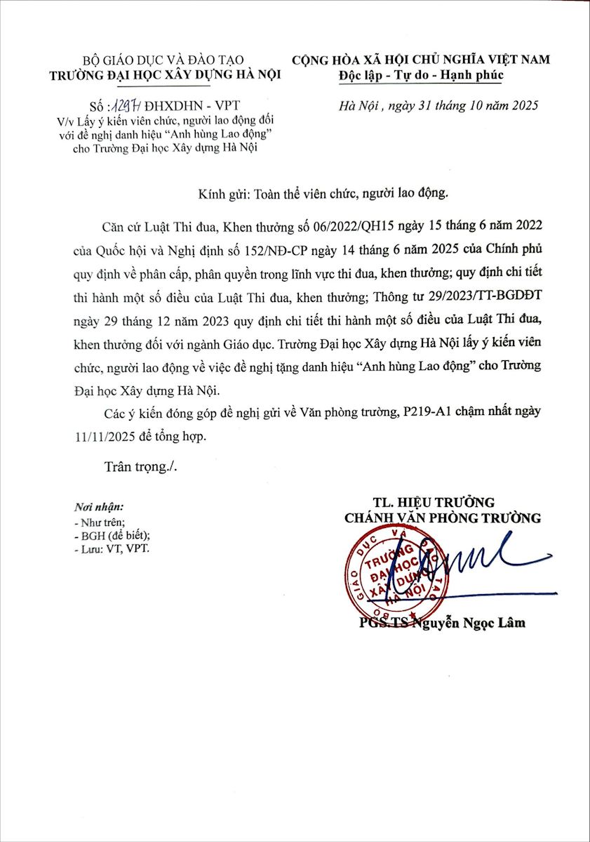 Căn cứ Luật Thi đua, Khen thưởng số 06/2022/QH15 ngày 15 tháng 6 năm 2022 của Quốc hội và Nghị định số 152/NĐ-CP ngày 14 tháng 6 năm 2025 của Chính phủ quy định về phân cấp, phân quyền trong lĩnh vực thi đua, khen thưởng; quy định chi tiết thi hành một số điều của Luật Thi đua, khen thưởng; Thông tư 29/2023/TT-BGDĐT ngày 29 tháng 12 năm 2023 quy định chi tiết thi hành một số điều của Luật Thi đua, khen thưởng đối với ngành Giáo dục. Trường Đại học Xây dựng Hà Nội lấy ý kiến viên chức, người lao động về việc đề nghị tặng danh hiệu “Anh hùng Lao động” cho Trường Đại học Xây dựng Hà Nội. Các ý kiến đóng góp đề nghị gửi về Văn phòng trường, P219-A1 chậm nhất ngày 11/11/2025 để tổng hợp.