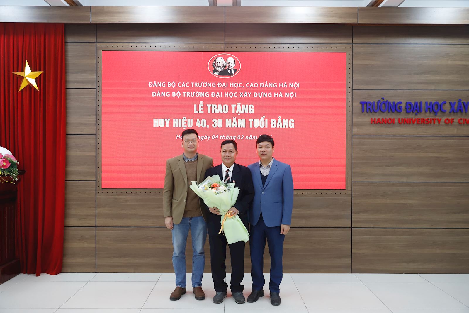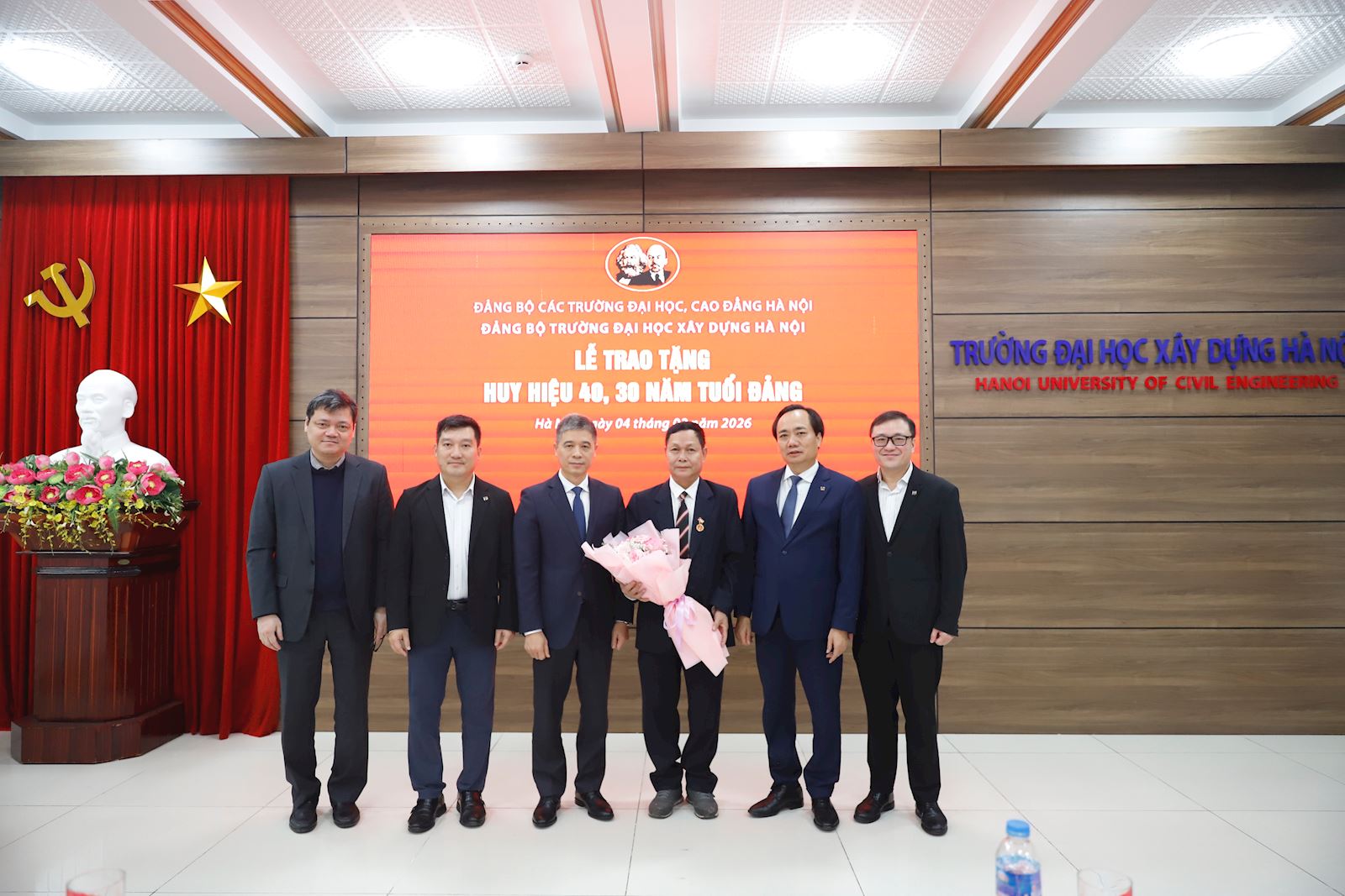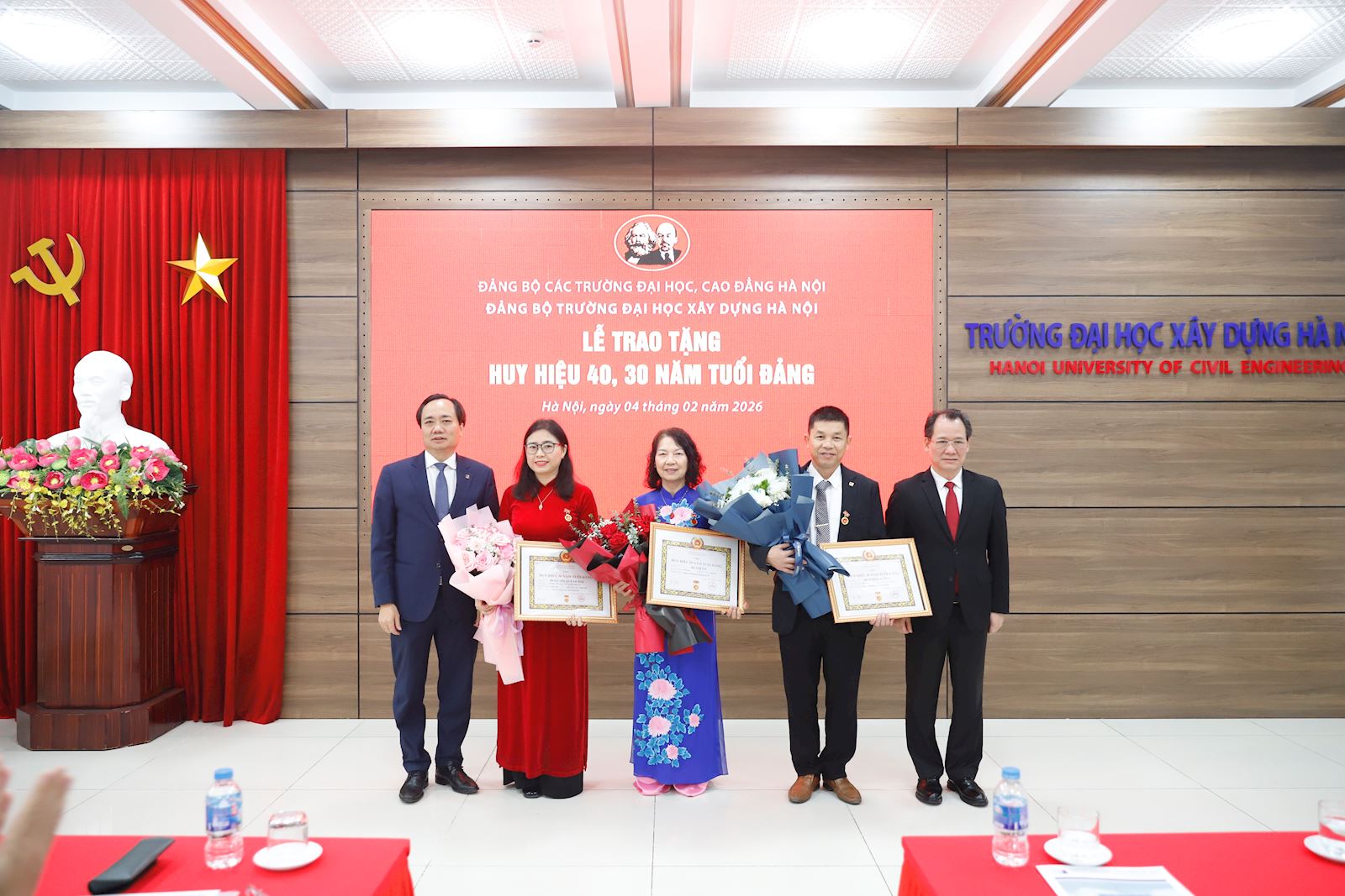 Xin chúc mừng các đồng chí được nhận Huy hiệu 40 - 30 năm tuổi Đảng, kính chúc các đồng chí sức khỏe và tiếp tục có nhiều đóng góp để Đảng bộ và Trường ĐHXDHN ngày càng vững mạnh.
