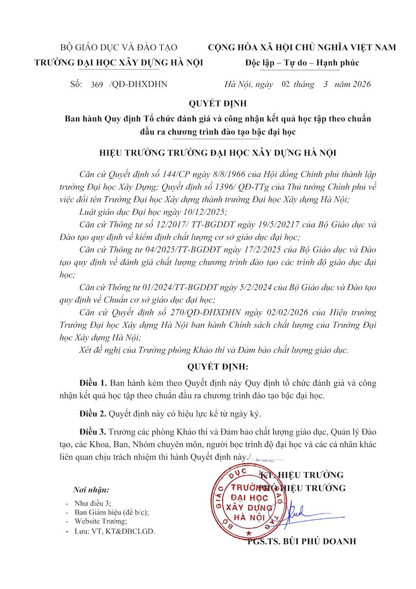 Quyết định số 369/QĐ-ĐHXDHN ngày 02 tháng 3 năm 2026 Ban hành Quy định Tổ chức đánh giá và công nhận kết quả học tập theo chuẩn đầu ra chương trình đào tạo bậc đại học của Trường Đại học Xây dựng Hà Nội.