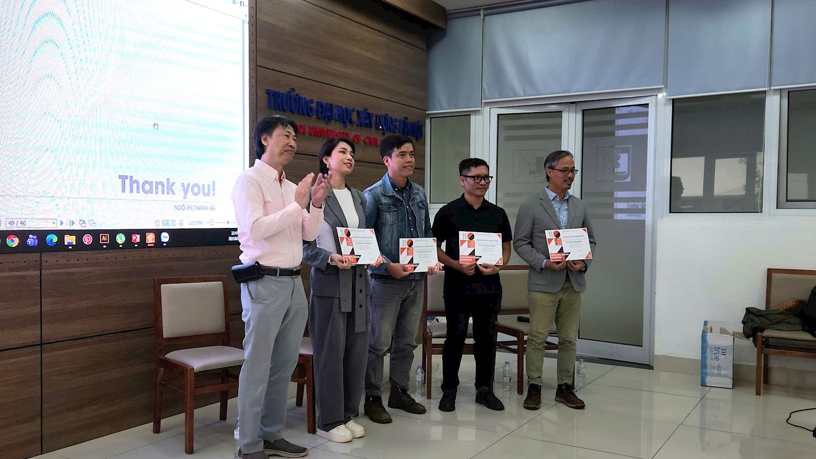 Thay mặt Ban tổ chức, TS. Vương Trọng Đức - Trưởng Nhóm chuyên môn Cơ sở nghệ thuật, Khoa KT&QH đã trao Chứng nhận danh dự cho các chuyên gia, nhà thiết kế và các SV tham gia tích cực vào hoạt động của Triển lãm và Tọa đàm.