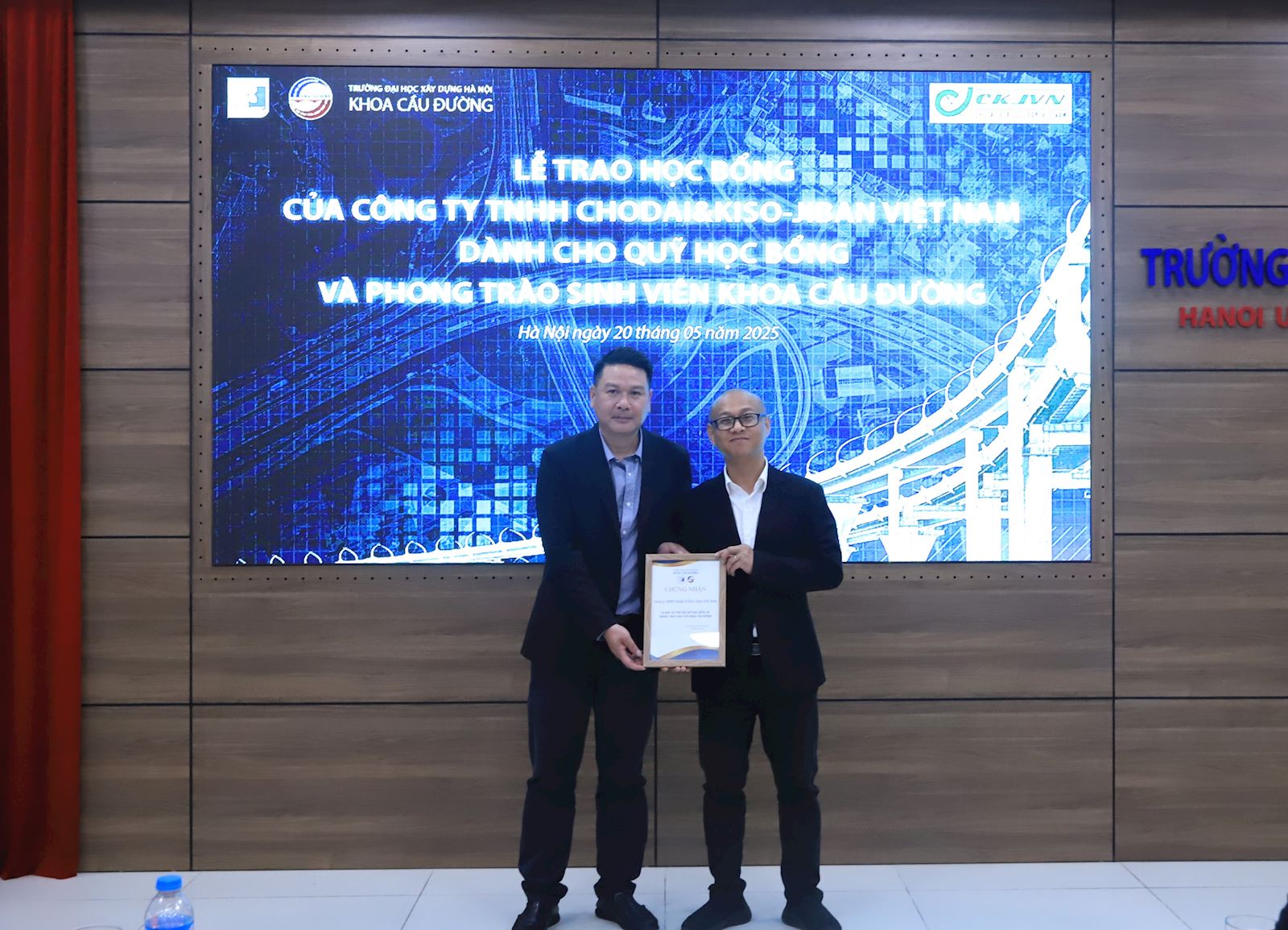 Đại diện Công ty CKJVN trao tặng học bổng cho Quỹ học bổng và Phong trào Sinh viên Khoa Cầu đường - Trường ĐHXDHN