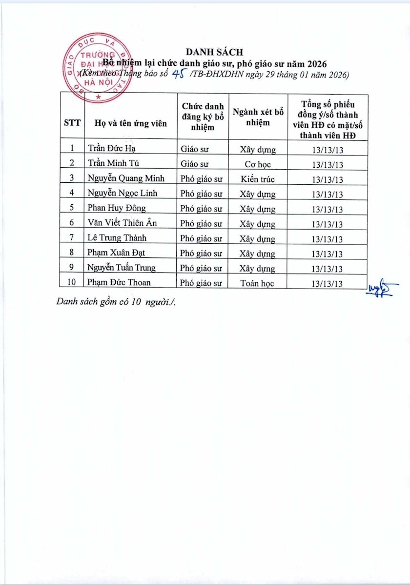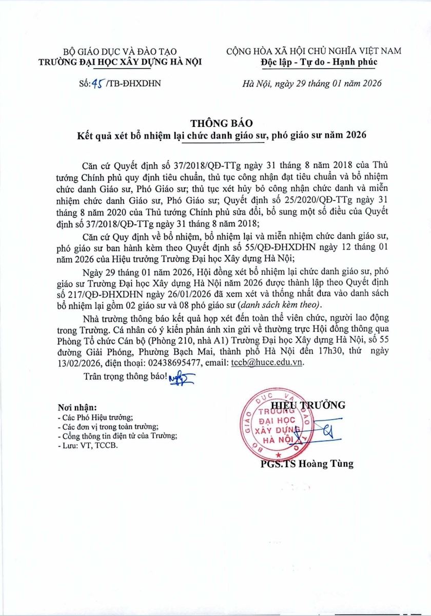 Trường Đại học Xây dựng Hà Nội ban hành thông báo số 45/ĐHXDHN về Kết quả xét bổ nhiệm lại chức danh Giáo sư, Phó Giáo sư năm 2026.