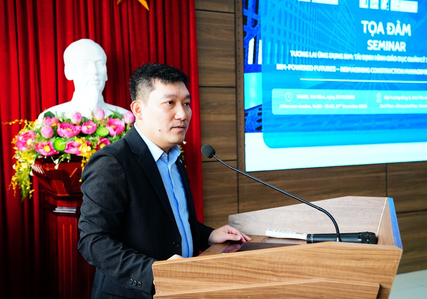 Phát biểu khai mạc, GS.TS Nguyễn Hoàng Giang - Phó hiệu trưởng Trường Đại học Xây dựng Hà Nội nhấn mạnh, chuyển đổi số đã trở thành con đường tất yếu của ngành Xây dựng, trong đó Mô hình hóa Thông tin Xây dựng (BIM) giữ vai trò cốt lõi. Với gần 60 năm phát triển và mới được công nhận là một trong năm trường đại học kỹ thuật trọng điểm quốc gia, Trường Đại học Xây dựng Hà Nội xác định trách nhiệm tiên phong đưa công nghệ BIM vào đào tạo, đặc biệt trong chương trình Thạc sĩ Quản lý Xây dựng.
