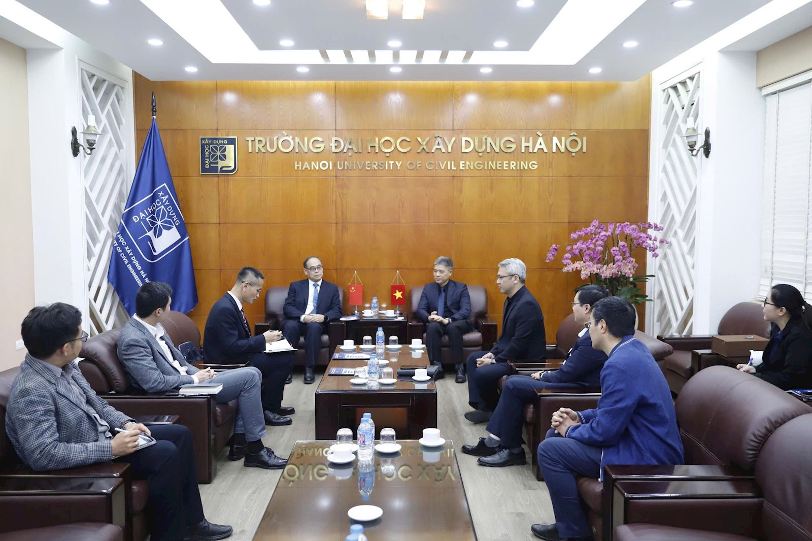 Tham dự buổi tiếp đón, về phía Đại sứ quán Trung Quốc có: Ông La Diệu Quang – Tham tán, Ông Vương Đình Quán - Bí thư thứ nhất. Về phía Trường ĐHXDHN có PGS.TS Hoàng Tùng - Hiệu trưởng, PGS.TS Bùi Phú Doanh - Phó Hiệu trưởng cùng đại diện các đơn vị: Phòng Hợp tác Quốc tế, Phòng Quản lý đào tạo, Kiến trúc và Quy hoạch.